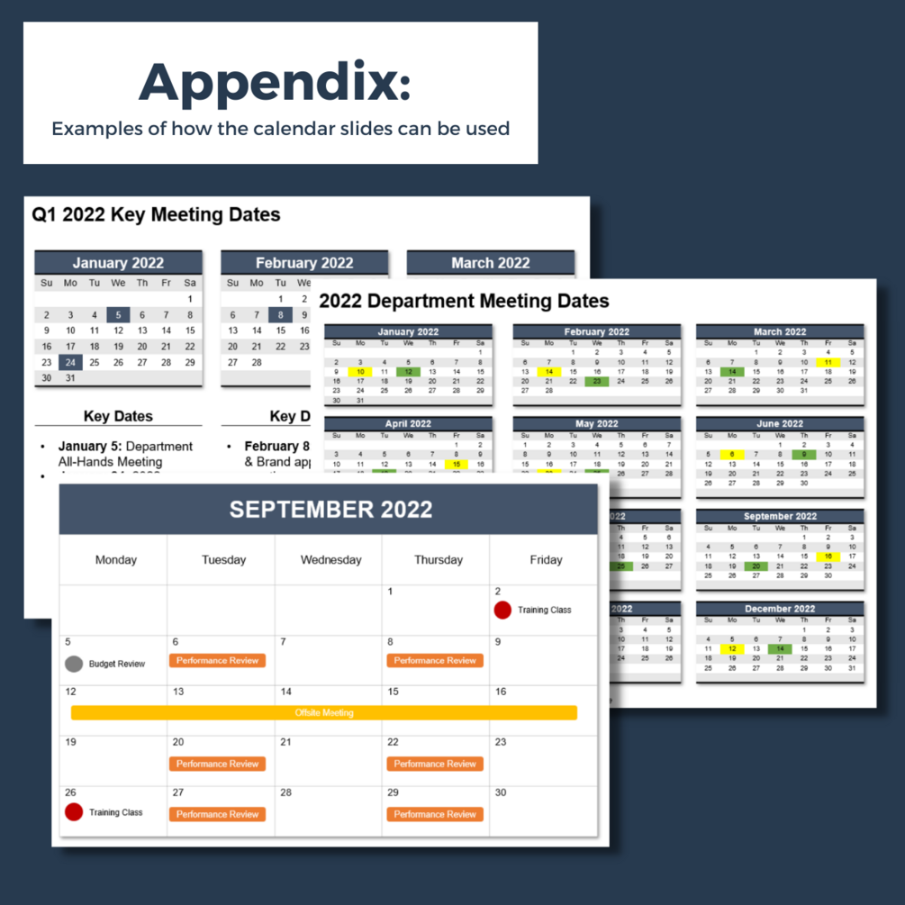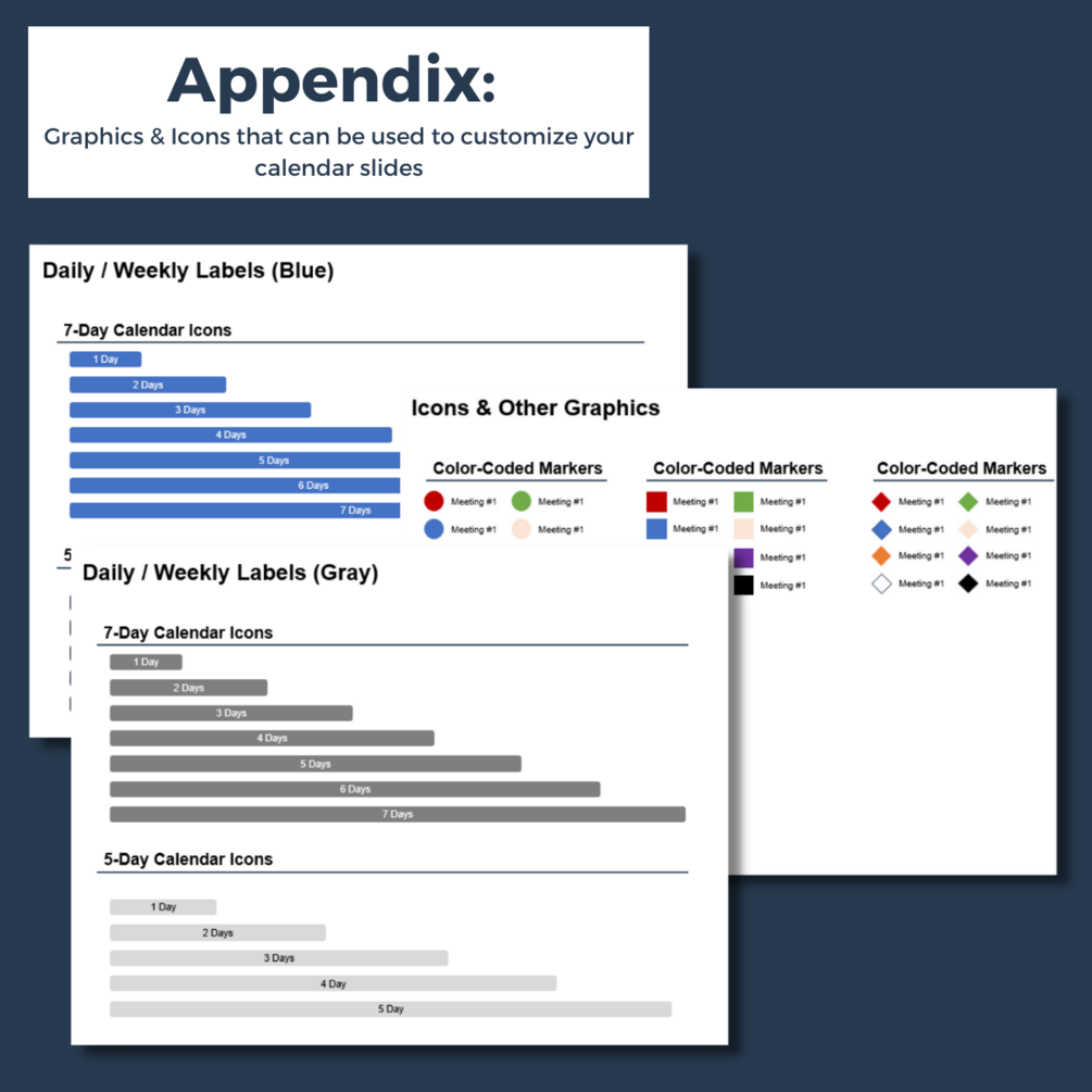 - Appendix including examples of how these calendar templates can be used and an icon library so you can customize these calendars for your own uses